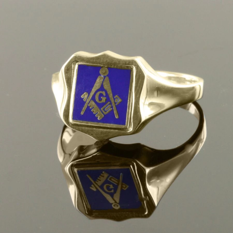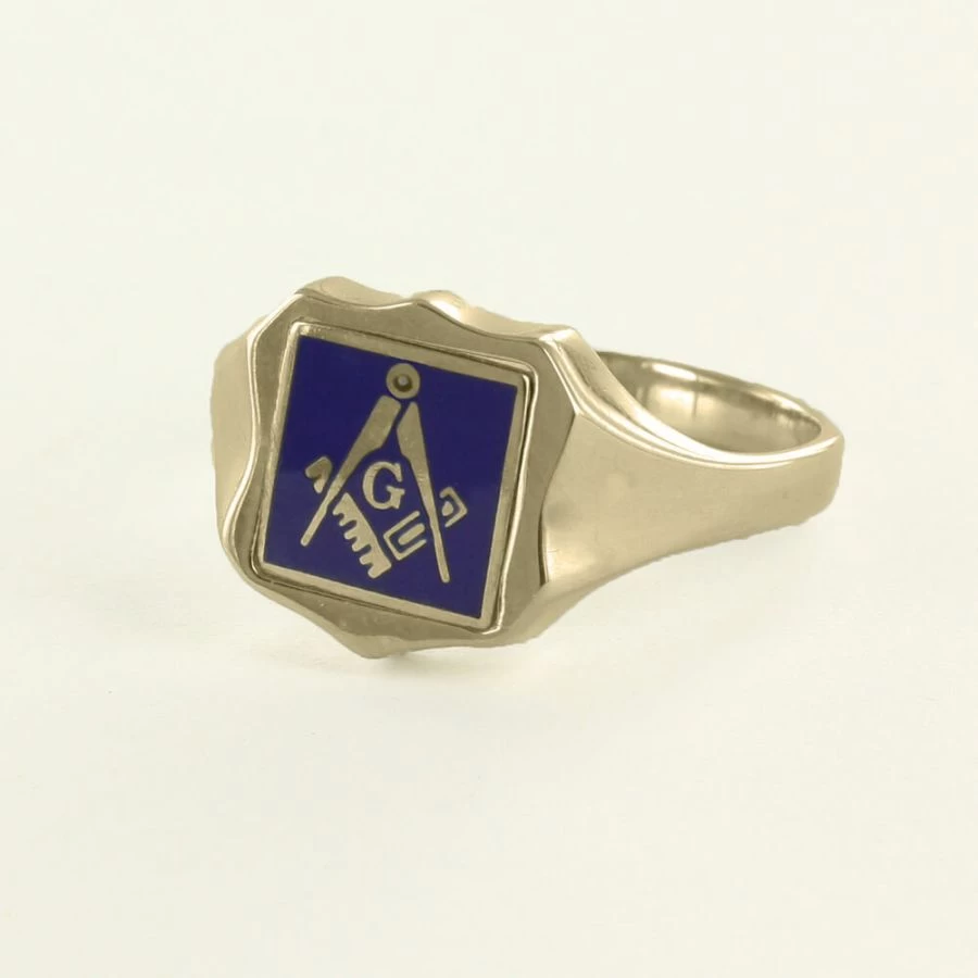 Manufactured by our professional craftsmen based within the Jewellery Quarter Birmingham, a Hallmarked Solid 9ct Yellow Gold Reversible Masonic Ring depicting the “square and compass with G” symbol within a blue vitreous enamelled shield shaped setting.