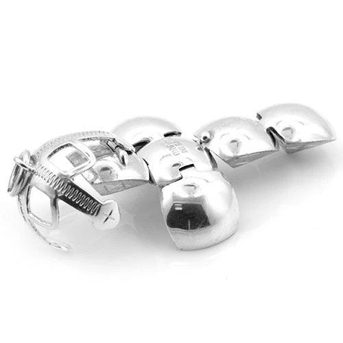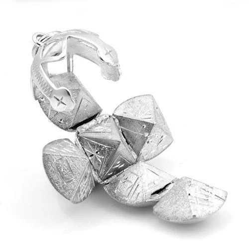 Each pyramid is held to its neighbour by secure hinges, when folded back into a ball its secured by 3 arms which constitutes its holder. The holder itself features a jump ring making it easy to wear as a fob on a watch chain, a pendant or charm on a bracelet.