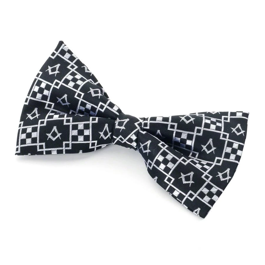 Masonic 100% silk woven pre-tied (adjustable) Bowtie. Great design with Silver woven Pavemnent and Square & Compass. Bowtie comes packaged in a clear sleeve.