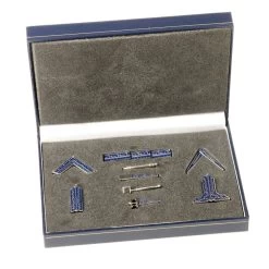 We include all of the working tools in this small set; the Twenty-four Inch Gauge, the Common Gavel and the Chisel of the First Degree are the tools of preparation; the Square, Level and Plumb Rule of the Second Degree are the tools of proof; the Skirret, Pencil and Compasses of the Third Degree are the tools of plan.