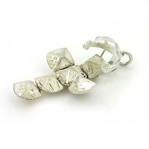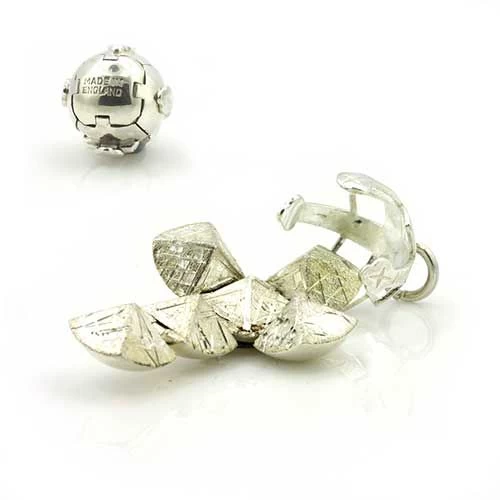 Each pyramid is held to its neighbor by secure hinges, when folded back into a ball its secured by 3 arms which constitutes its holder. The holder itself features a jump ring making it easy to wear as a fob on a watch chain, a pendant or charm on a bracelet.