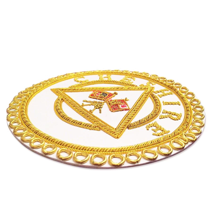 This smooth-textured RA Chapter Provincial Apron Badge is crafted using finely-finished lambskin. It features hand lettered texts embroidered using gold bullion wire. The badge also features beautifully embroidered in the center, the Rank design. The badge is padded sewn to perfection using strong bullion wire. It is supplied in cellophane packet.