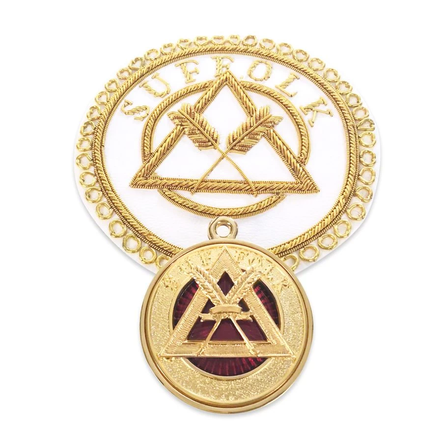 The handmade apron badge is 110mm diameter in size and beautifully crafted using Gold bullion thread by our experienced staff. Badge has a 3M sticky peel off back, additional adhesive can be used when attaching to your apron for a stronger long lasting fix. The Royal Arch Chapter Provincial Collar jewel is Gold plated and polished with a ring fitting to attach to your provincial collar.