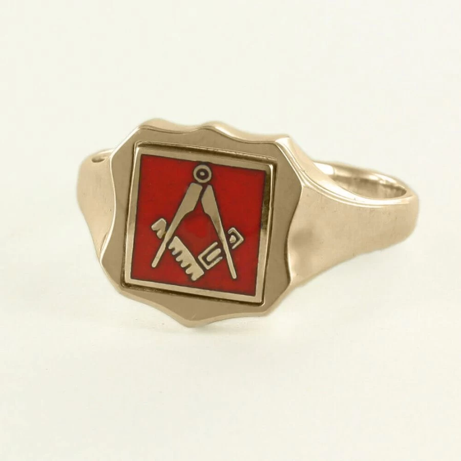 Manufactured by our professional craftsmen based within the Jewellery Quarter Birmingham, a Hallmarked Solid 9ct Yellow Gold Reversible Masonic Ring depicting the “square and compass” symbol within a red vitreous enamelled shield shaped setting.