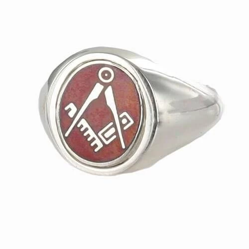 Manufactured by our professional craftsmen based within the Jewellery Quarter Birmingham, a Hallmarked Solid Silver (925) Reversible Masonic Ring depicting the “square and compass” symbol within a red vitreous enamelled setting.