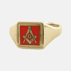 Manufactured by our professional craftsmen based within the Jewellery Quarter Birmingham, a Hallmarked Solid 9ct Yellow Gold Reversible Masonic Ring depicting the “square and compass with G” symbol within a Red vitreous enamelled square shaped setting.