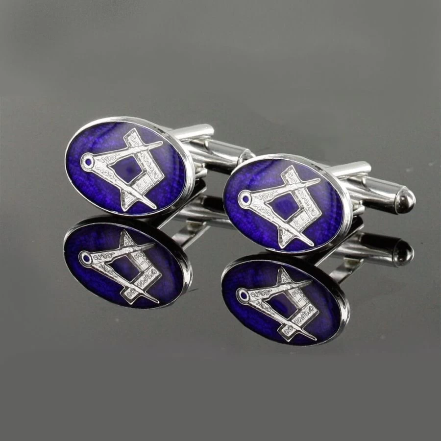 A pair of Silver Plated Masonic Cufflinks with a Modern Square and Compass motif set in Blue Enamel in the centre. Cufflinks are highly polished and come complete in an appropriate presentation box.