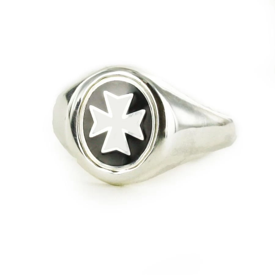 A crafted Knights of Malta (KOM) Masonic Ring in hallmarked solid silver with a fixed head. Featuring an Oval head in black enamel depicting the motif of the Knights of Malta in the centre.